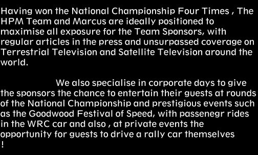 We can tailor a sponsorship package to suite all budgets and needs. Please contact us for more information - 01202 661919 marcus@hpminvestments.co.uk